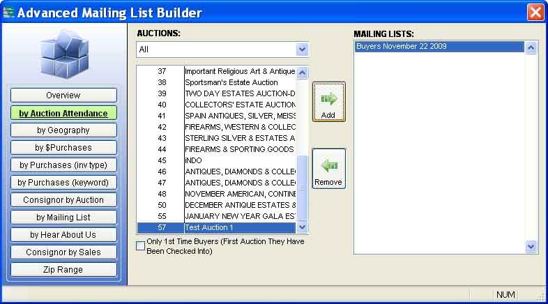 The Advanced Mailing List Builder has tabs that enable you to create mailing lists based on various criteria. These criteria can be used in combination to target your audience for specific auctions or in general to separate your returning or active customers from those that have not attended an auction over a period of time. Target your buyers by sorting for keywords, inventory types purchased, or purchase volumes for a period of time.
